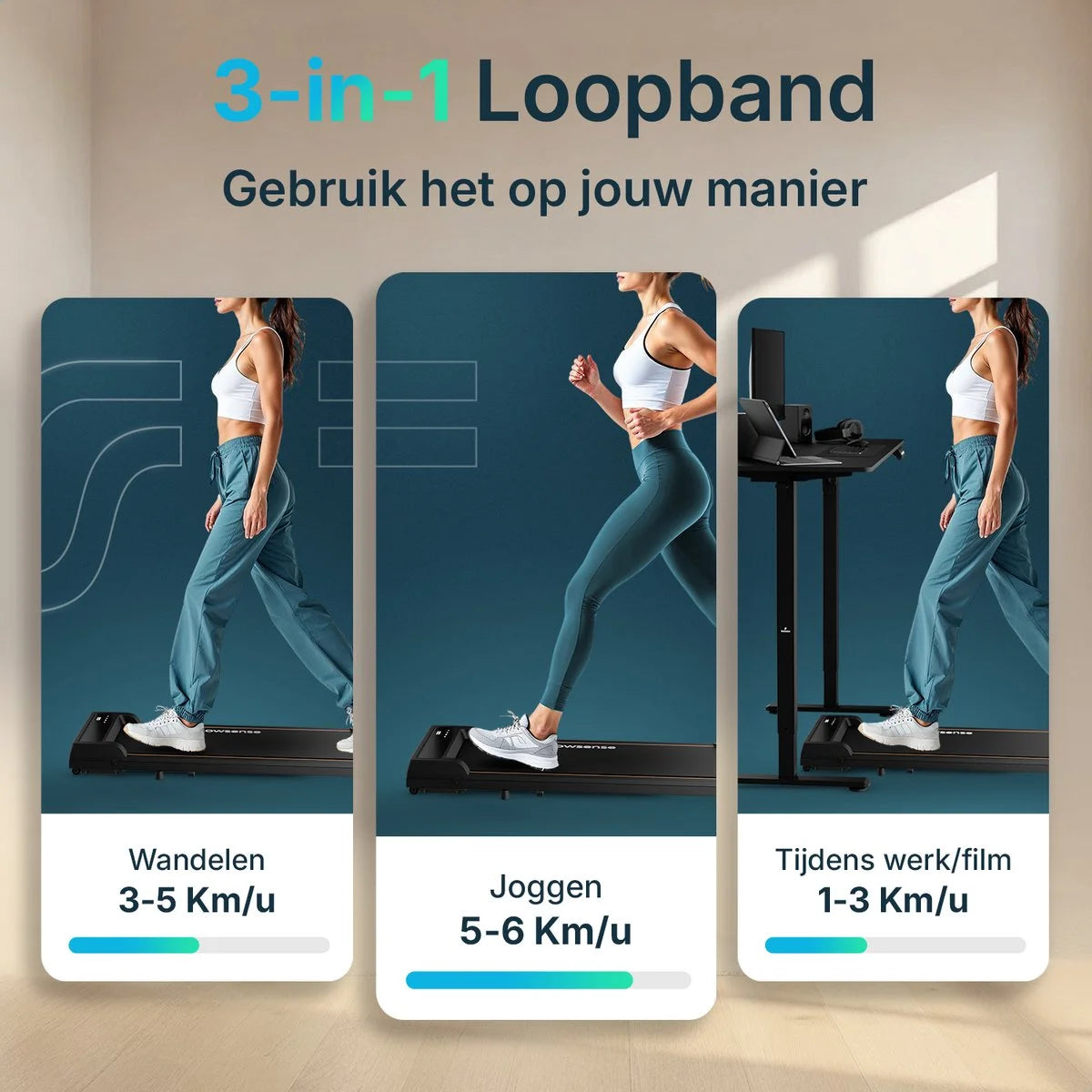 Schuif de loopband onder je zit-sta bureau en start met bewegen. Dit is de perfecte manier om productiviteit en beweging te combineren: werk, vergader of bel terwijl je wandelt.