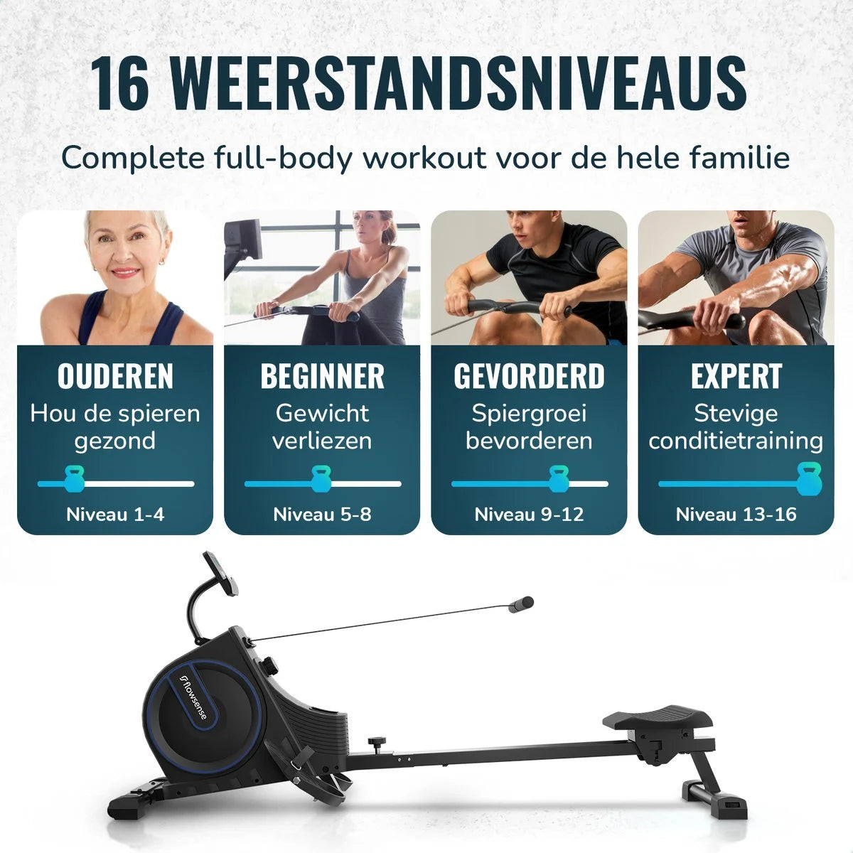 Met 16 instelbare weerstandsniveaus is de roeitrainer geschikt voor zowel beginners als ervaren roeiers. Door de magnetische weerstand en versterkte nylon riem geniet je van een fluisterstille en comfortabele roeitraining.