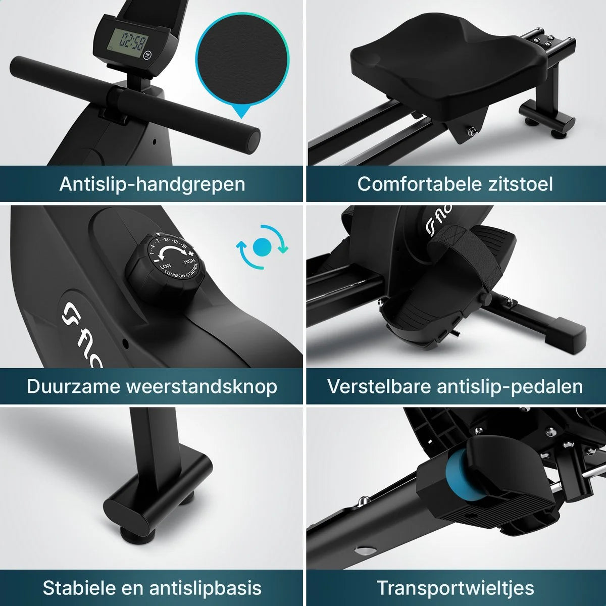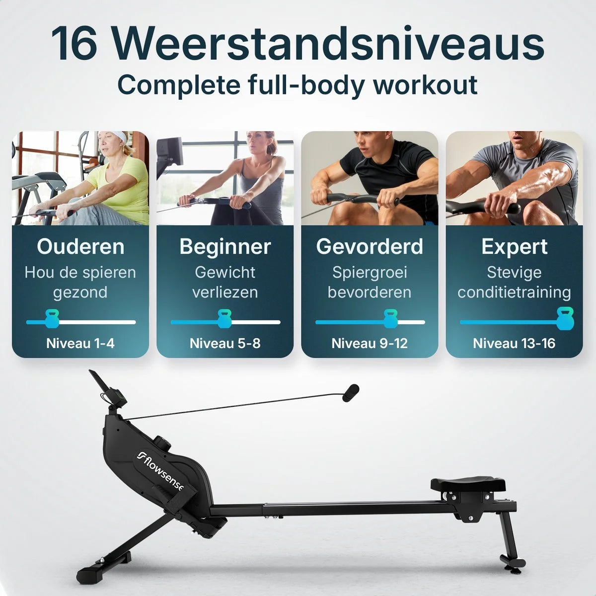 Met 16 instelbare weerstandsniveaus is de roeitrainer geschikt voor zowel beginners als ervaren roeiers. Door de magnetische weerstand en versterkte nylon riem geniet je van een fluisterstille en comfortabele roeitraining.